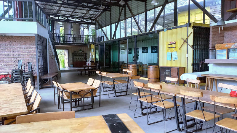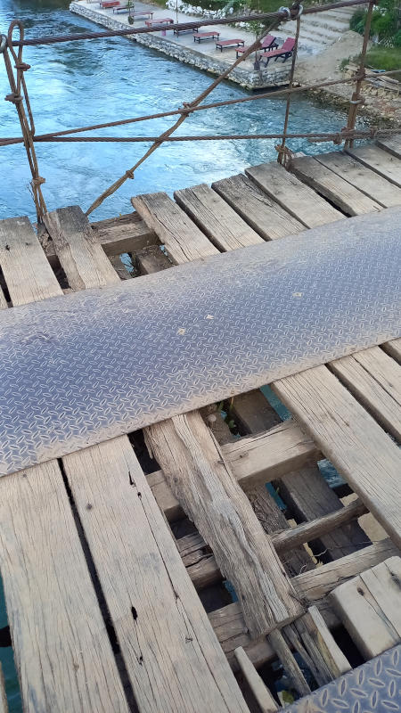 Vang Vieng – wir quälen uns aus dem Bus. Das Gepäck ist noch vollständig und der Hahn scheint auch überlebt zu haben. Die paar hundert Meter zum Hotel gehen wir zu Fuß. Eine weitere Herausforderung für unsere Osprey’s. Die üblichen asiatischen Gehwege kann man kaum als solches bezeichnen, oft muss auf die Straße ausgewichen werden und die Nebenstraße zum Hotel führt uns über einen mit groben Geröll befestigten Pfad an eine Brücke, die ihre besten Zeiten bereits hinter sich hat. Notdürftig mit Brettern vernagelt, ist der Übergang nichts für schwachen Nerven. Am Ufer entlang offenbaren sich schöne, relaxte Strandbars und auch unser favorisiertes Hotel „Kong“ zeigt sich als Top-Adresse. Etwas was man als Designer-Hotel bezeichnen kann, konstruiert aus alten Übersee-Containern gepaart mit traditionellen Baumaterialien, wie Holz, Beton und Metallrohren. Was jedoch unklar bleibt ist: Warum das Hotel „Kong“ heißt, uns jedoch am Eingang ein überlebensgroßer „Hulk“ begrüßt. Ein Sprung in den Pool und entspannen an der Hotelbar entschädigen uns der Anreisestrapazen.