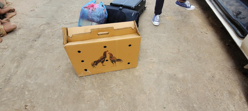 Wir fragen uns laut, warum jemand mit einem Karton reist. Unsere Konfusität nimme unser französische Sitznachbarin war: „A Chicken is inside“. Tatsächlich unglaublich wir befinden uns in einem Tiertransport.