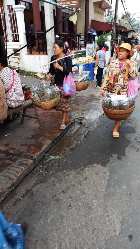 Den Abend wollen wir gemütlich im Stadtzentrum bei einem Abendessen und Bummel durch das Nachtleben ausklingen lassen. An der Walking Street angekommen stellen wir uns zunächst unter und beobachen den Abbau des ein oder anderen Verkaufsstandes – ein Regenschauer überkommt uns. Das Vela Cafe & Restaurant ist unsere Wahl des Abends. Ein empfehlenswerte Restaurant mit laotischen Spezialitäten und sehr aufmerksamen Service. Es gehört zu einem Backpacker-Hotel, welches offensichtlich gerne von jungen Leuten aus aller Welt genutzt wird.