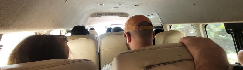 Nach kurzer Fahrt – noch ein Reisegast, nicht gerade von der schlanken Sorte. Oh mein Gott, wie soll das gehen? Und ausgerechnet soll er auch noch in die hintere Reihe. Jetzt ist diese mehr als voll! Ob wir das die 180km lange Strecke durchstehen? Und dann noch ein Stopp mit Zuladung. Wir zählen durch. 16 Leute sitzen wie Sardinen eng auf einander.