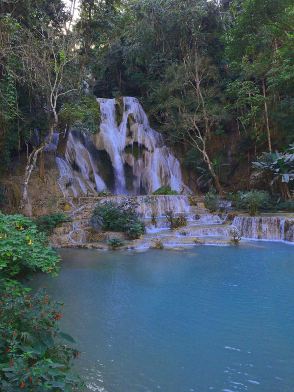 Nun war Zeit für einen Ausflug zum nahegelegenen Kung Si Wasserfall. Ein Tuk Tuk brachte uns über die holprigen Strassen in die Berge zum Wasserfall. Da Sonntag war waren auch viele Einheimische zum Picknicken dort. Der Wasserfall ist wirklich sehr schön, verläuft über mehrere Ebenen und das Wasser ist wunderschön hellblau. Der Hauptwasserfall ist ungefähr 100 m hoch. Zeit zum Schwimmen! Das hat wirklich Spaß gemacht bei erfrischenden Wassertemperaturen. Kleine Fische kamen immer wieder, um an den Füßen zu knabbern. Wir erfrischten uns noch mit einem kühlen Bier bevor wir uns auf den Rückweg machten, die an einer Bärenrettungsstation vorbeiging. Die Braunbären werden hier aufgepäppelt und alle lagen faul in „Hängematten“ oder einfach nur auf Felsen herum.