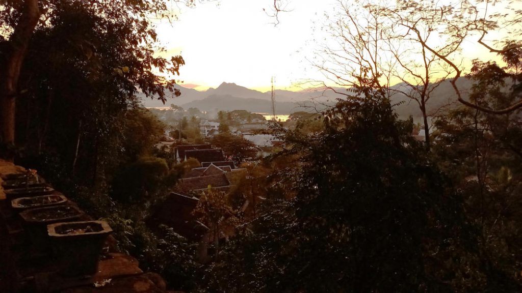 Unser Tuk Tuk-Fahrer brachte uns wieder zurück in die Stadt. In einer coolen Kneipe erfrischten wir uns noch etwas, bevor wir die vielen Stufen zum Berg Phosi und dem Tempel darauf hinauf stiegen. Die Aussicht dort oben ist wirklich atemberaubend über ganz Luang Prabang und den Mekong. Gerade noch vor Einbruch der Dämmerung geschafft.