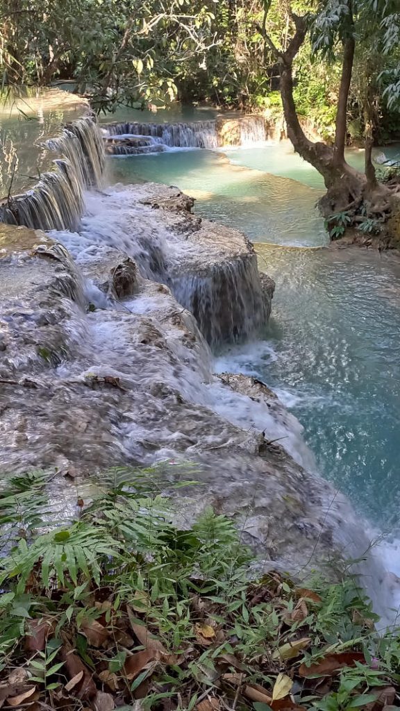 Nun war Zeit für einen Ausflug zum nahegelegenen Kung Si Wasserfall. Ein Tuk Tuk brachte uns über die holprigen Strassen in die Berge zum Wasserfall. Da Sonntag war waren auch viele Einheimische zum Picknicken dort. Der Wasserfall ist wirklich sehr schön, verläuft über mehrere Ebenen und das Wasser ist wunderschön hellblau. Der Hauptwasserfall ist ungefähr 100 m hoch. Zeit zum Schwimmen! Das hat wirklich Spaß gemacht bei erfrischenden Wassertemperaturen. Kleine Fische kamen immer wieder, um an den Füßen zu knabbern. Wir erfrischten uns noch mit einem kühlen Bier bevor wir uns auf den Rückweg machten, die an einer Bärenrettungsstation vorbeiging. Die Braunbären werden hier aufgepäppelt und alle lagen faul in „Hängematten“ oder einfach nur auf Felsen herum.